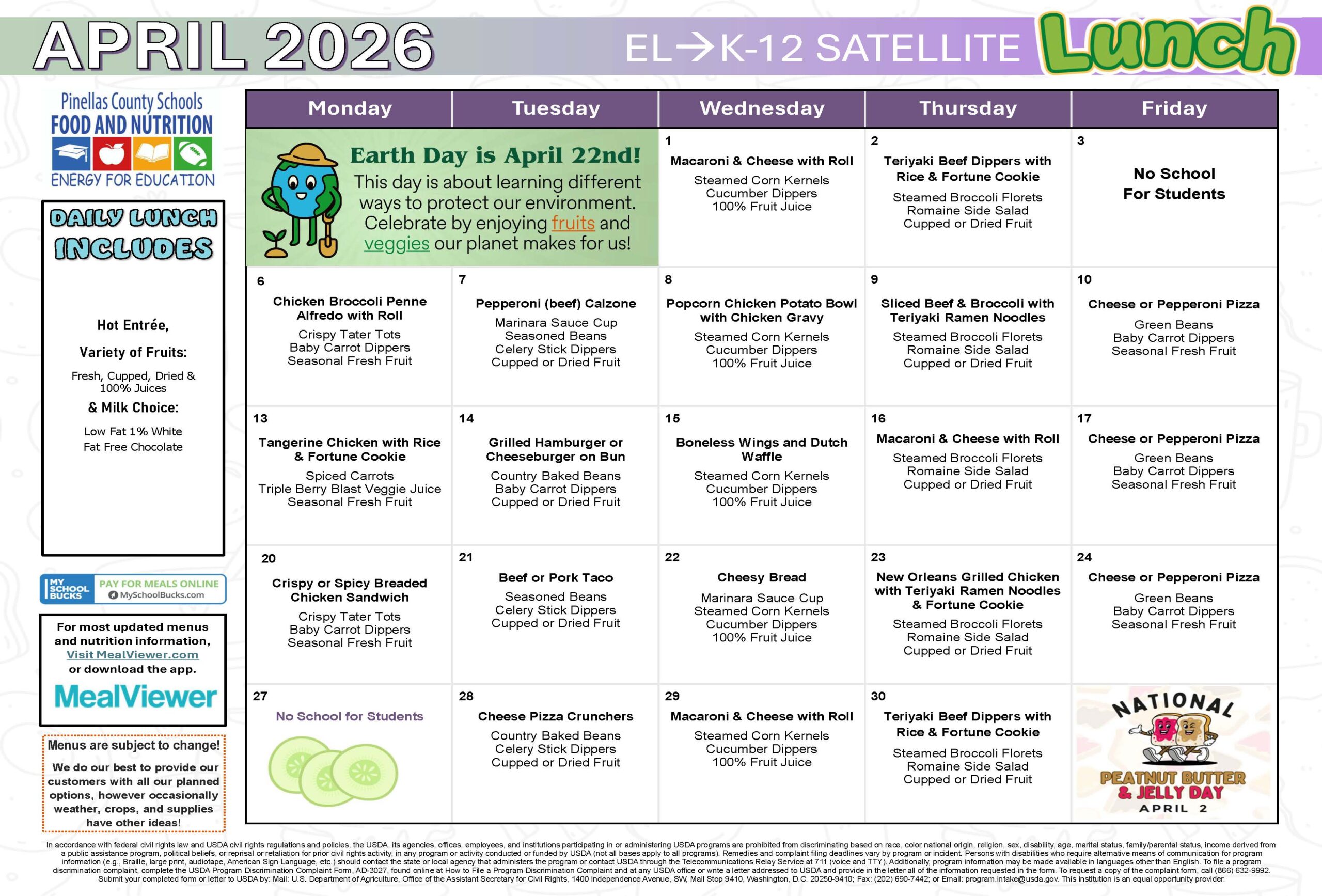 View monthly menu and nutrition facts here: https://schools.mealviewer.com/school/DiscoveryAcademyofScience